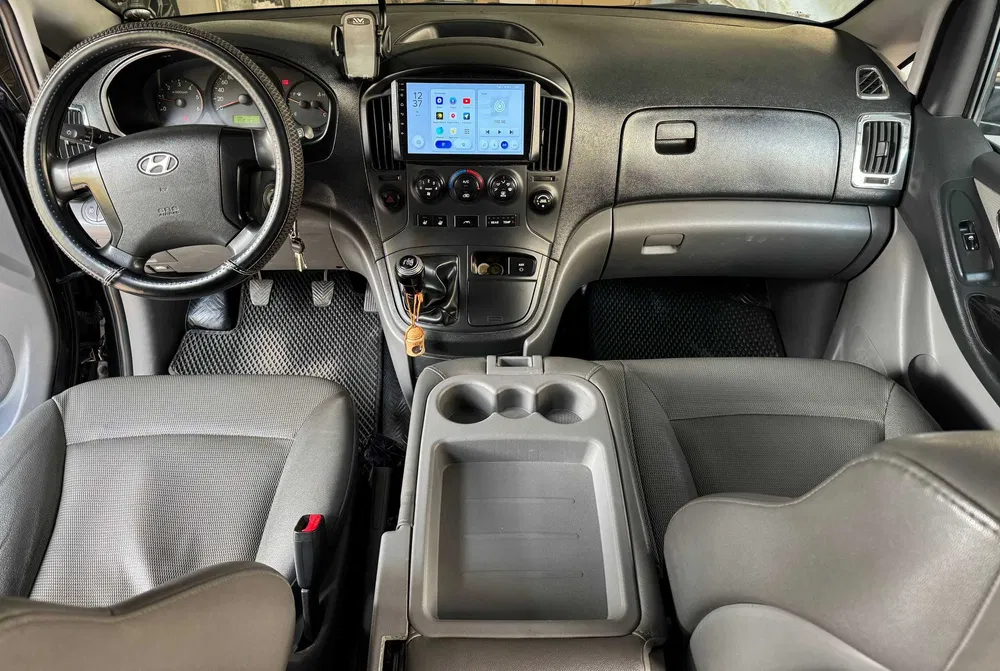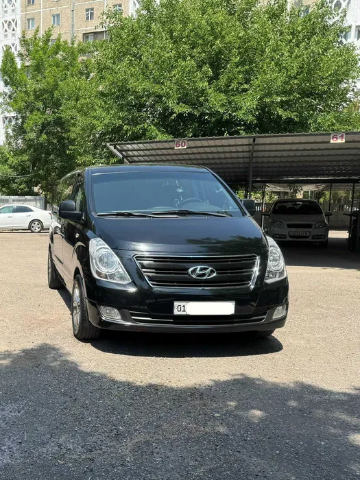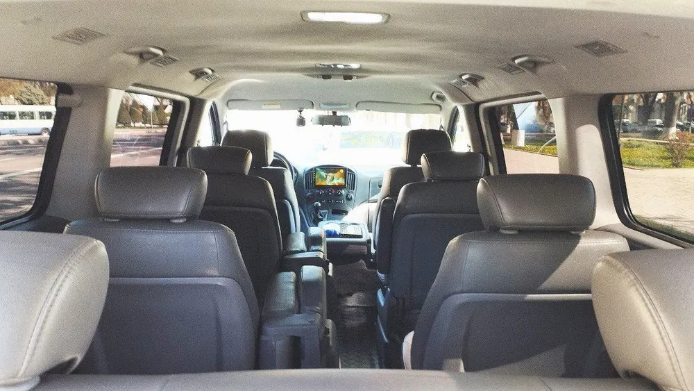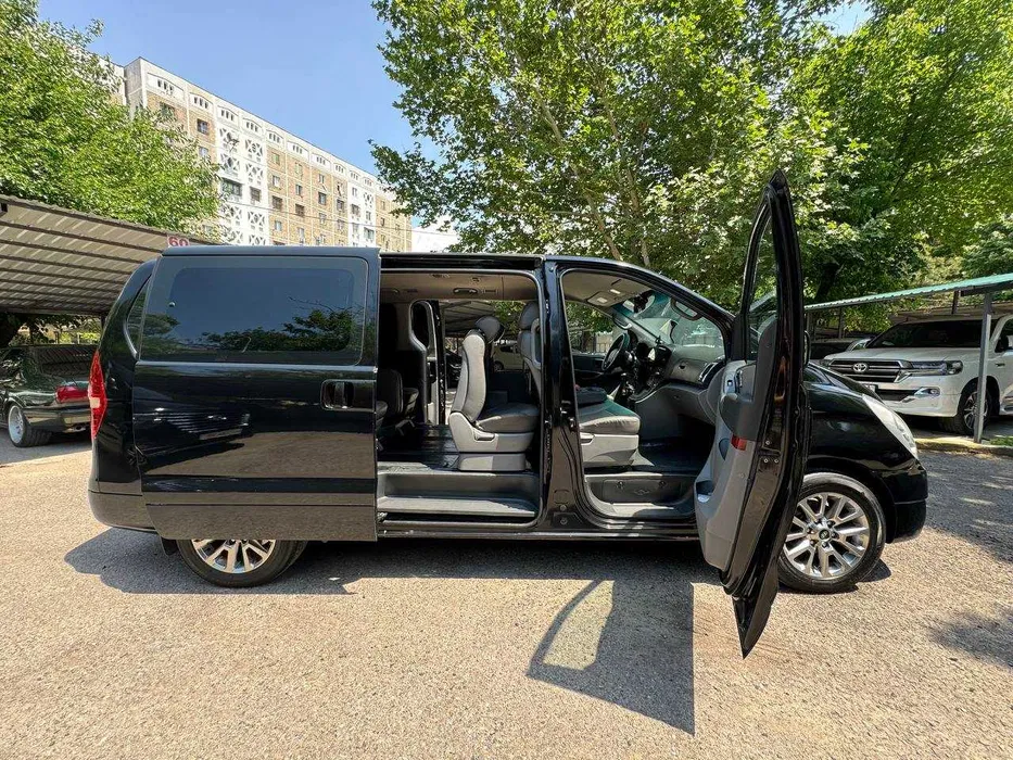 Avtomobillar: Sizning didingizga mos keladigan qulay o'rindiqlar, konditsioner va yoqimli musiqaga ega qora Hyundai Starex H1 minivenlari.